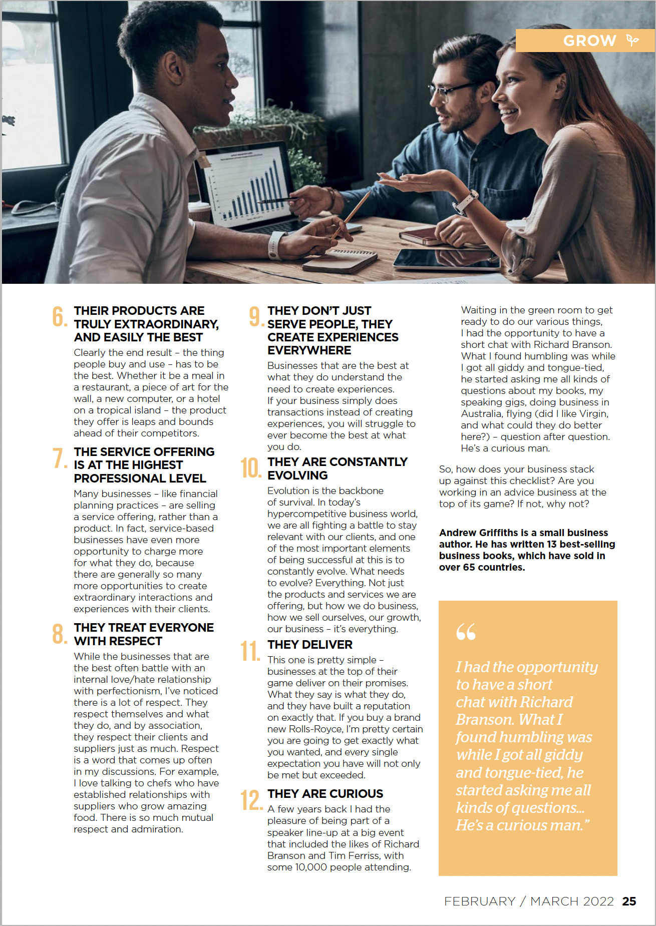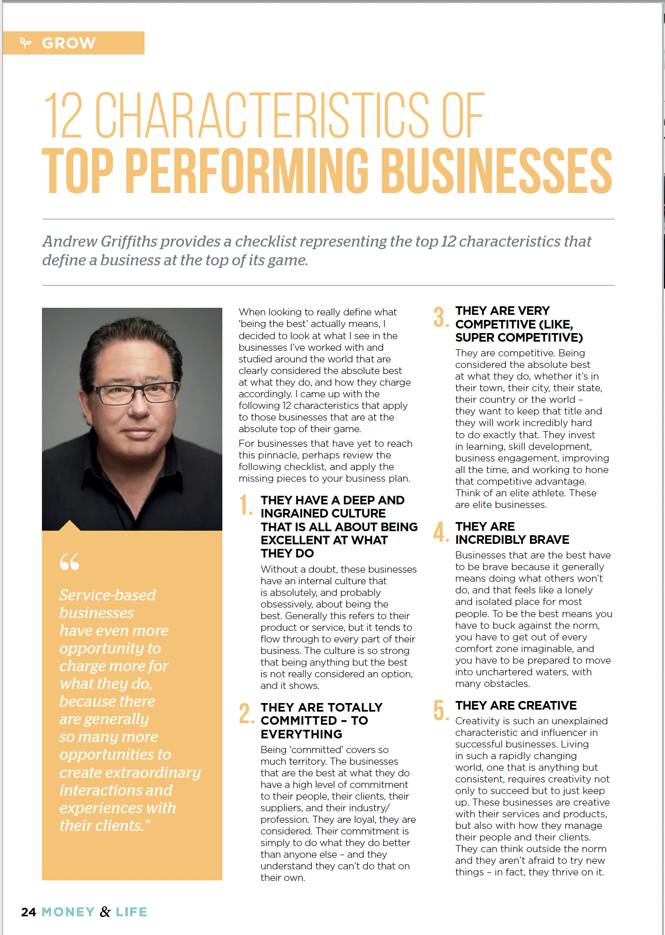 I was recently asked to write an article for Money & Life Magazine – on the characteristics of high performing business. Here are the characteristics that I have observed over many years. Cheers – Andrew